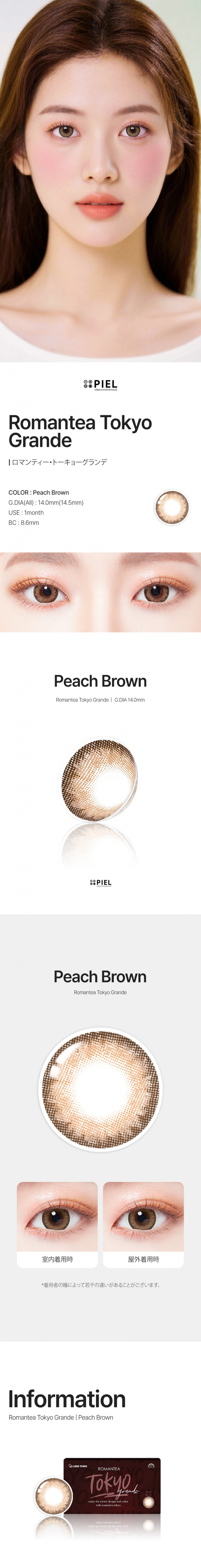 | レンズ情報 | キュ―トなのに大人の雰囲気もだせちゃうカラコン大人気商品「Romanteatokyo」からグランデサイズが新登場☆魅力的な瞳に思わずうっとりしちゃうような不思議なカラ― 幻想的な雰囲気を演出しやすく淡いピンクメイクがおすすめ♡ 「Romanteatokyogrande Peachbrown」 |
