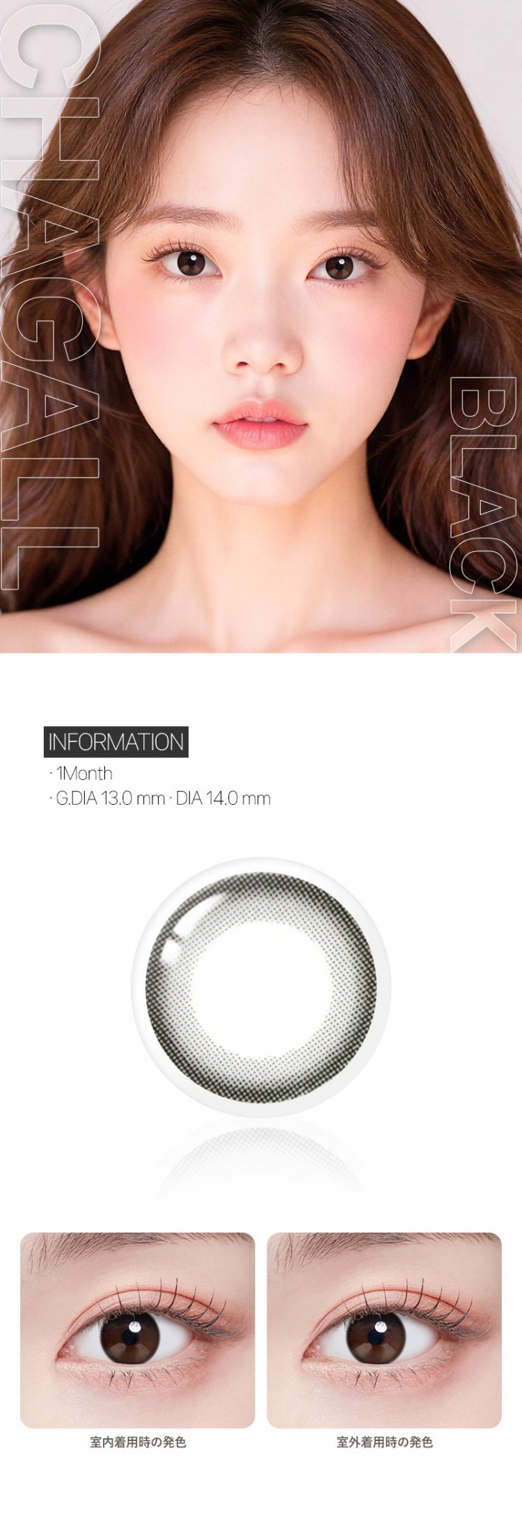 | レンズ情報 | つけてるけどつけていないようなこのシンプルさ! 何もしてないような自然美。裸眼と比べてもバレない仕上がり! 普段使いにピッタリなので初心者の方もぜひ挑戦してみてくださいね。 自分の瞳、そのままの魅力を最大限り引き出すチャガール。 アジア人の瞳の比率に合わせたこだわりのカラコン!「チャガールブラック Chagall 」 |