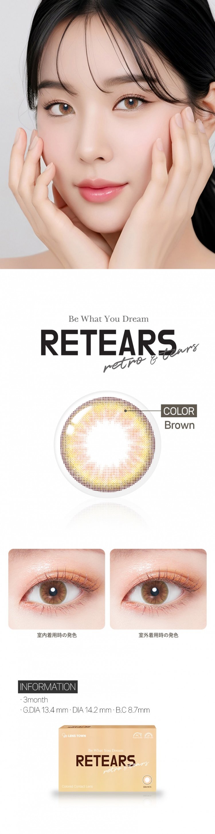 レンズ情報 | レトロで優しいカラーが夢幻的な雰囲気を演出する3トーンのカラーグラデが水に広がるようなデザインとマッチし絶妙な雰囲気を作り上げます♡ PCハイドロゲル配合だから、水分が蒸発しにくく乾きにくいレンズで ドライアイの方にもおすすめのカラコンです☆「レティアーズ ブラウン RETEARS BROWN」 |