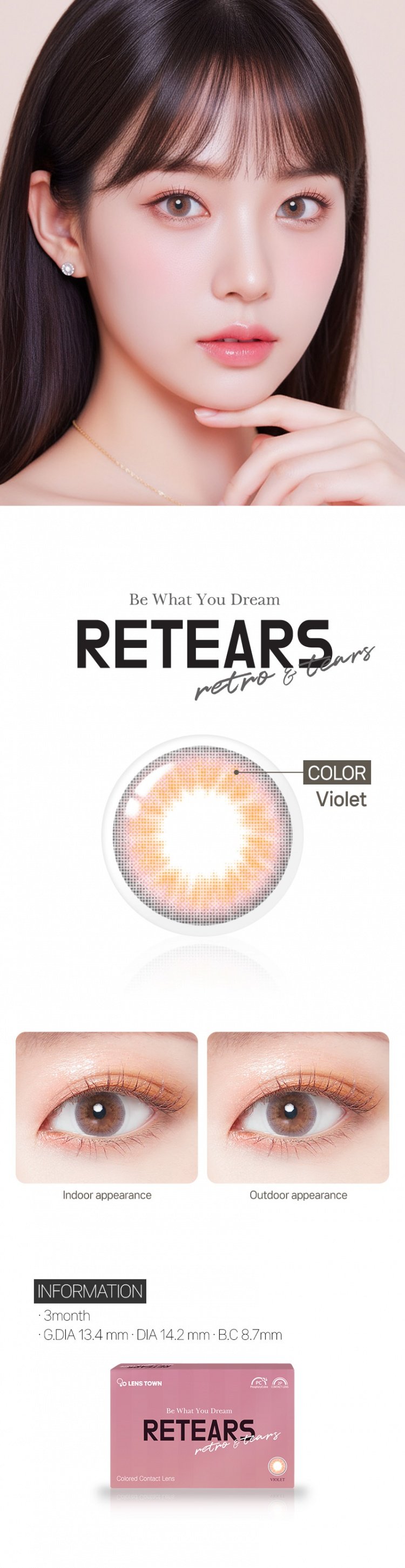 レンズ情報 | 自然な甘さのバイオレットカラコン♡ハデではない自然な3トーンカラーがお洒落な雰囲気を作り上げレトロがミックスされた夢幻的なデザインが瞳をキラキラと輝かせます PCハイドロゲル配合で、潤い続く快適な1日を♡ 「レティアーズ バイオレット RETEARS VIOLET」 |