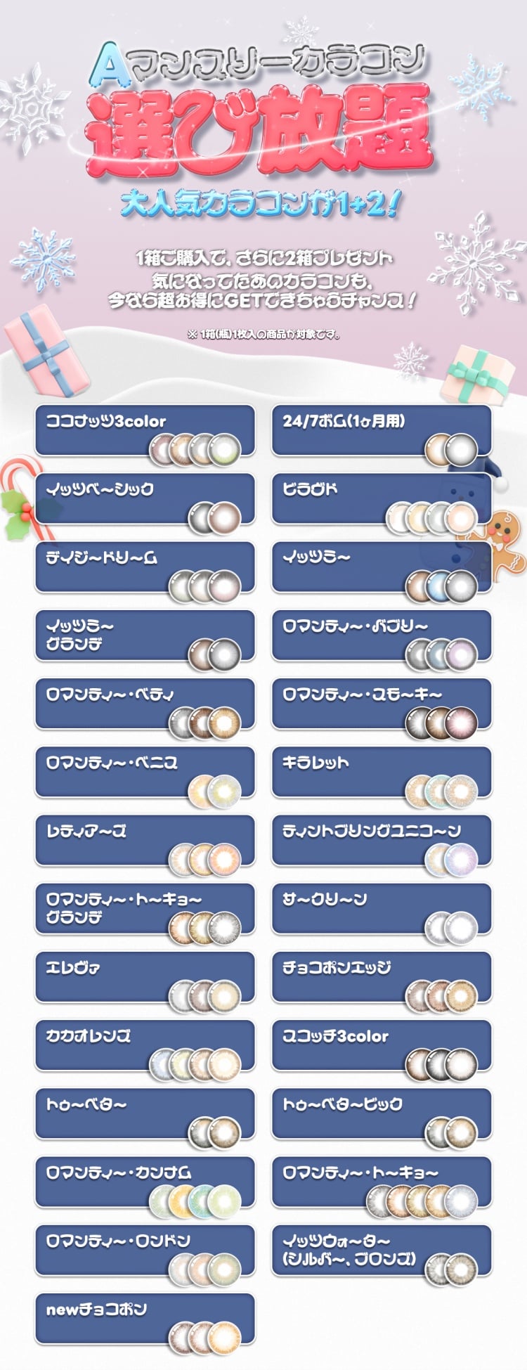 | レンズ情報 | 1つ購入で2つプレゼント✨- 気になってたあのカラコンも、今なら超お得にGETできちゃうチャンス! - 12月はイベントやお出かけが増える特別な月。 冬にぴったりのカラコンを今すぐゲット!シーズンに合わせて、あなたの瞳をもっと魅力的に。 【※1箱2枚入の全商品が対象です】 |