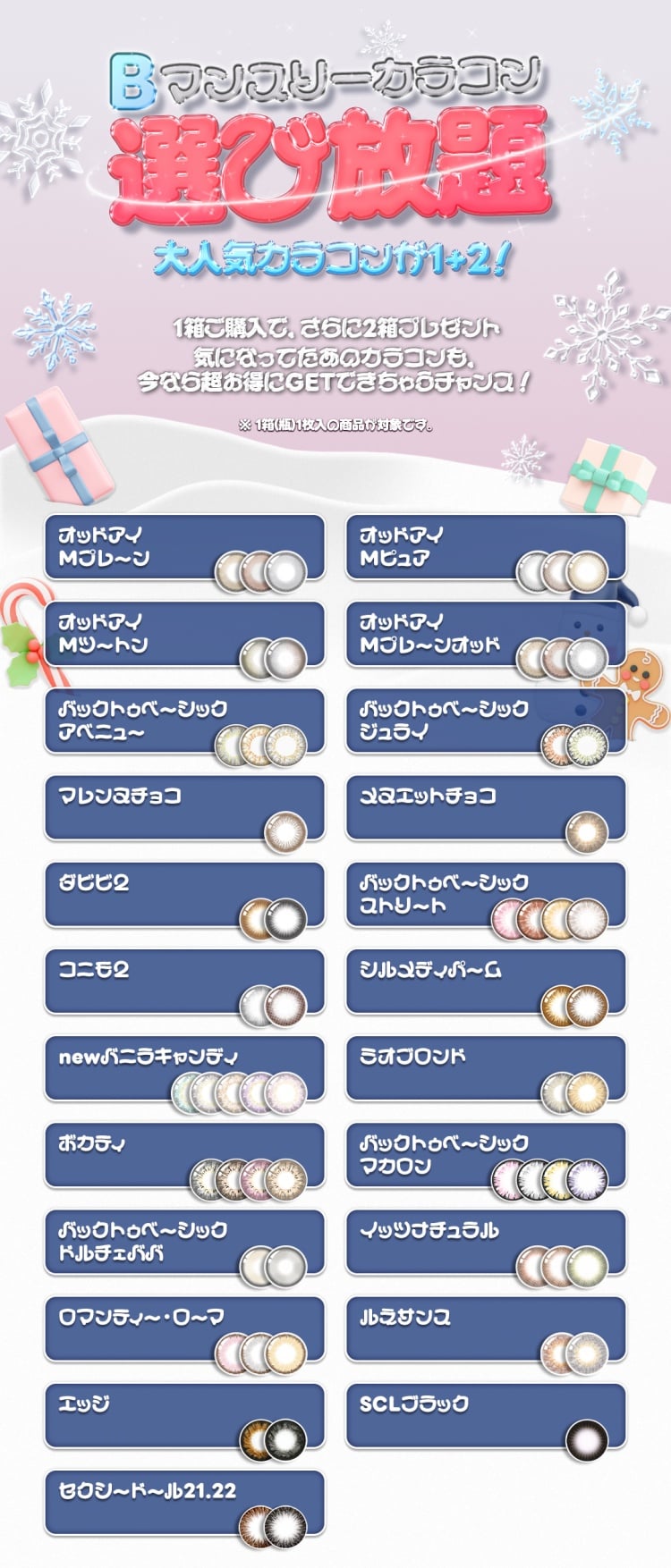 | レンズ情報 | 1つ購入で2つプレゼント✨- 気になってたあのカラコンも、今なら超お得にGETできちゃうチャンス! - 12月はイベントやお出かけが増える特別な月。 冬にぴったりのカラコンを今すぐゲット!シーズンに合わせて、あなたの瞳をもっと魅力的に。 【※1箱(瓶)1枚入の一部商品が対象です】 |
