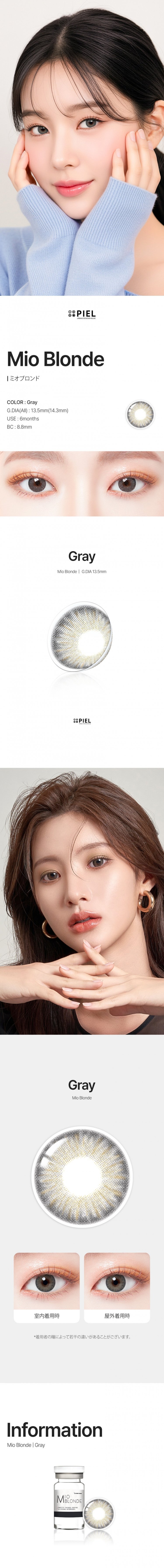 | レンズ情報 | 優雅で高級感のあるハーフアイに♡ 高発色なグレーと13.5㎜の着色直径で 吸い込まれるような魅力的な瞳になれます! 「ミオブロンドグレー Mio Blonde Gray」 |
