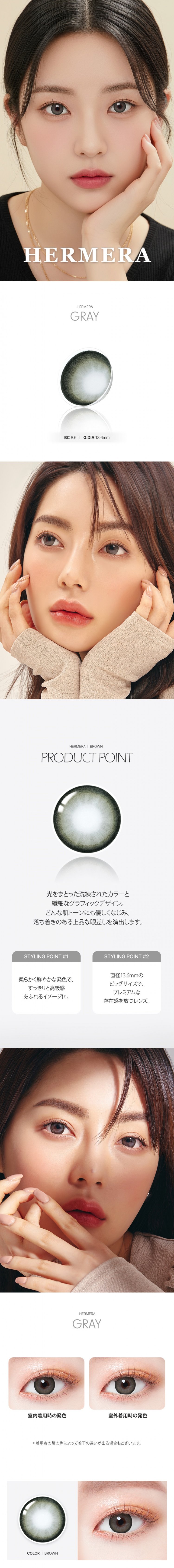 | レンズ情報 | ピエルから乾燥知らずの潤いレンズが登場☆大きめの着色直径ながら自然なサークルラインに洗礼されたカラーがポイント! ハーフアイになりすぎないデイリー使いにぴったりのグレーカラコンです♡ 「ヘルメラグレー Hermera Gray」 |