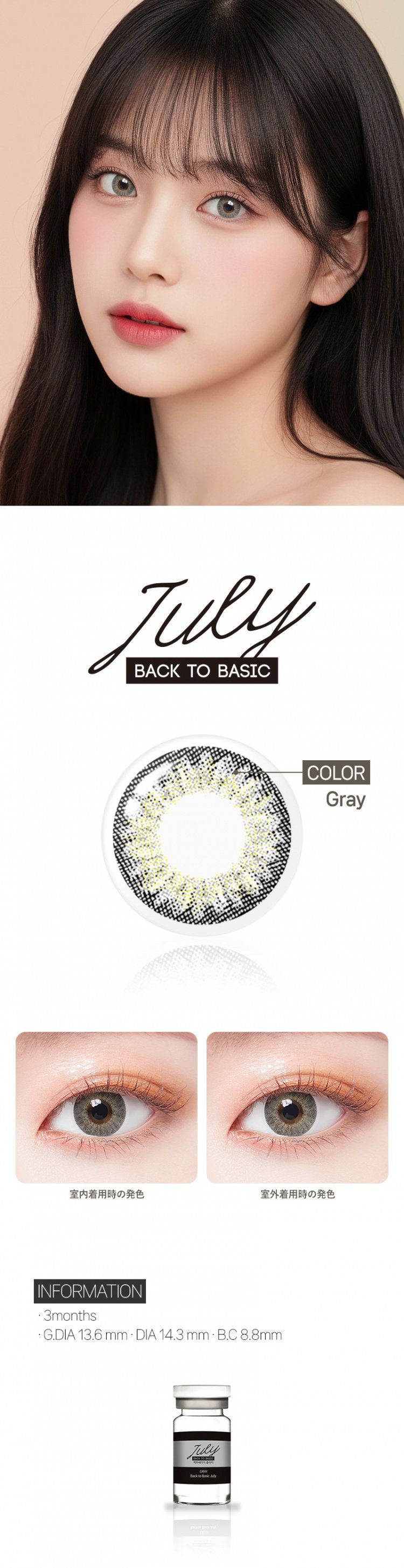 レンズ情報 | 色っぽさとオシャレさどっちも表現できる、こなれた雰囲気が格好いいナチュラルハーフカラコン2~3トンカラーMIXで瞳に立体感があってさりげなく盛れる瞳に★くっきりでも浮きにくい適度な色っぽさが際たつカラーでフェミニンな雰囲気を演出 憧れの美人に近づくカラコン「バックトゥベーシック ジュライグレー Back to Basic JULY Gray 」 |