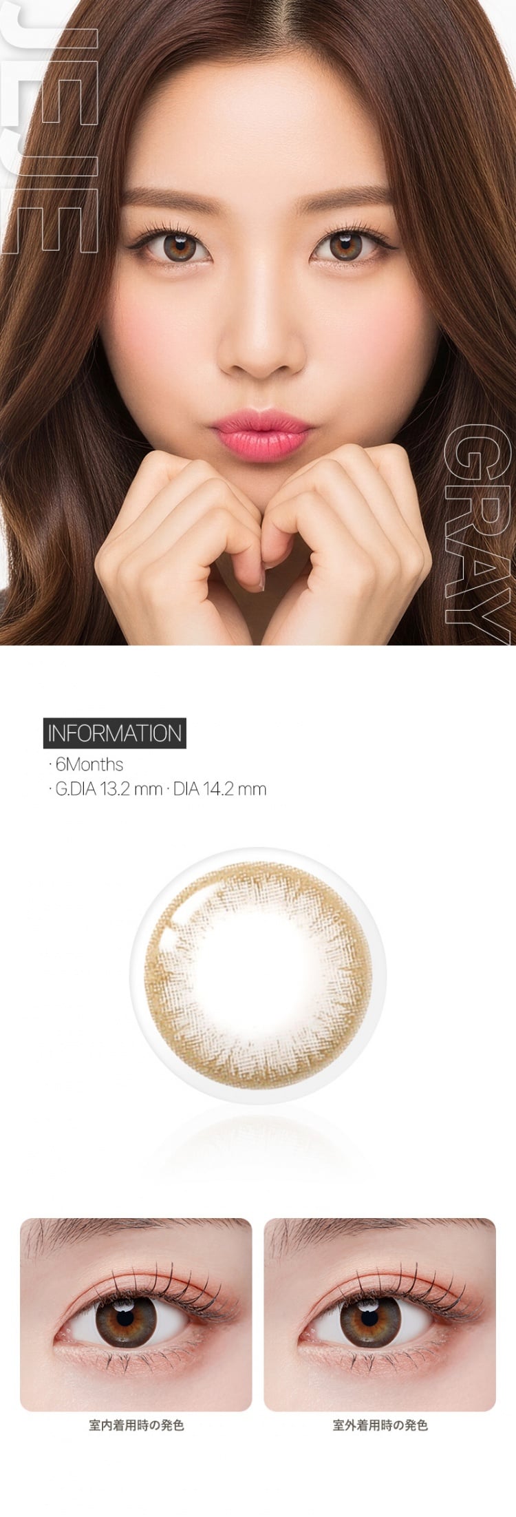 | レンズ情報 | ふんわりとした発色のジェジェグレー☆ 透明感のある薄めの発色で瞳と自然になじむ外国人風の瞳を演出! 使う場所やメイクを選ばないので使いがってGOOD! 一度使うと手放せなくなるカラコンです! カラーは、ブラウン・チョコ・グレーの3色。 |